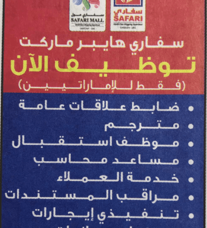 وظائف سفارى هايبر ماركت ، أعلن سفاري هايبر ماركت الامارات عن حاجتها لشغل عدة وظائف متنوعة في الكثير من التخصصات،…